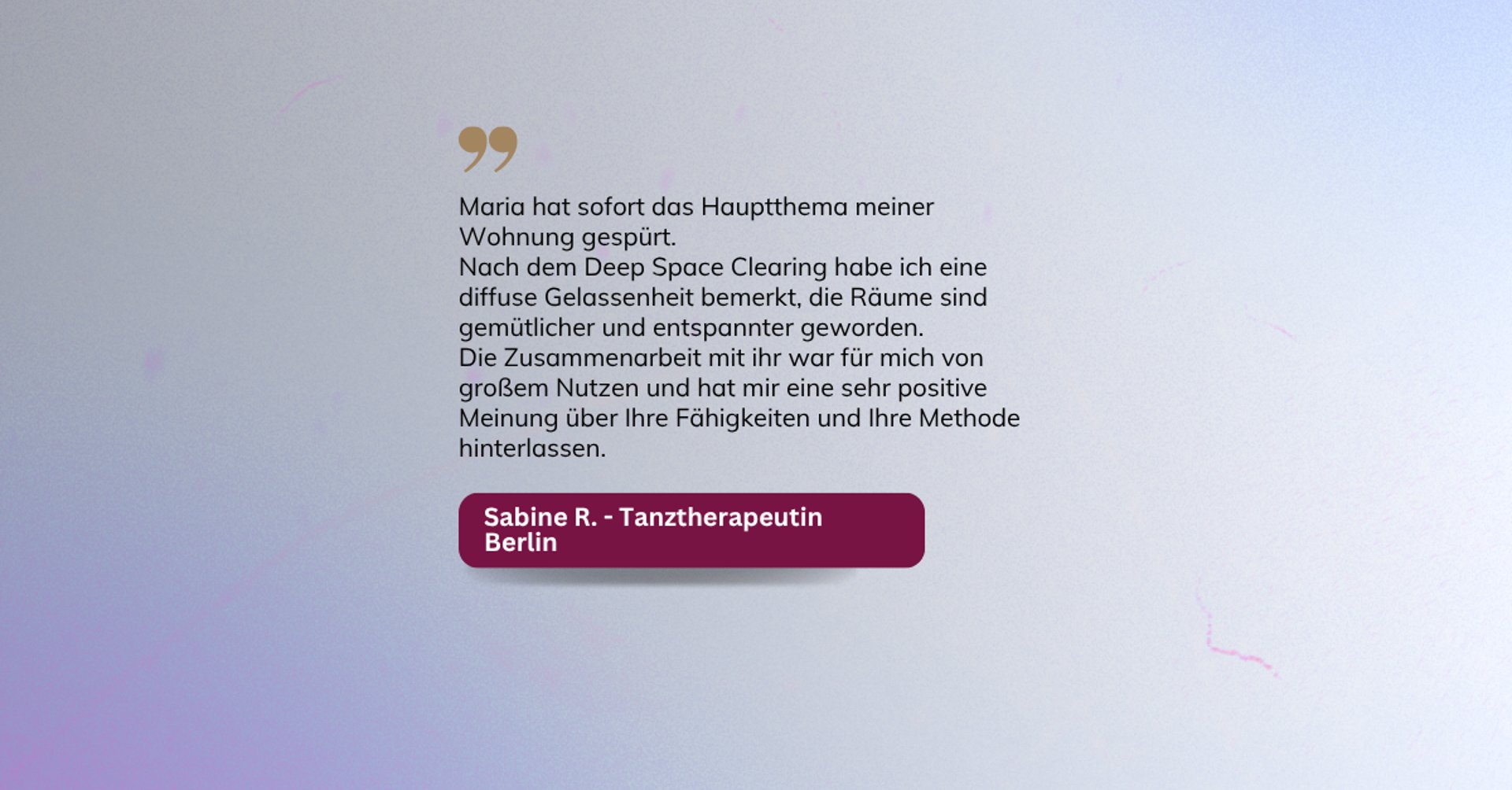 Wir haben Harmonie, Gelassenheit, Wohlbefinden wiederhergestellt, alle Faktoren, die neue Projekte im Leben der Kunden ermöglicht haben.